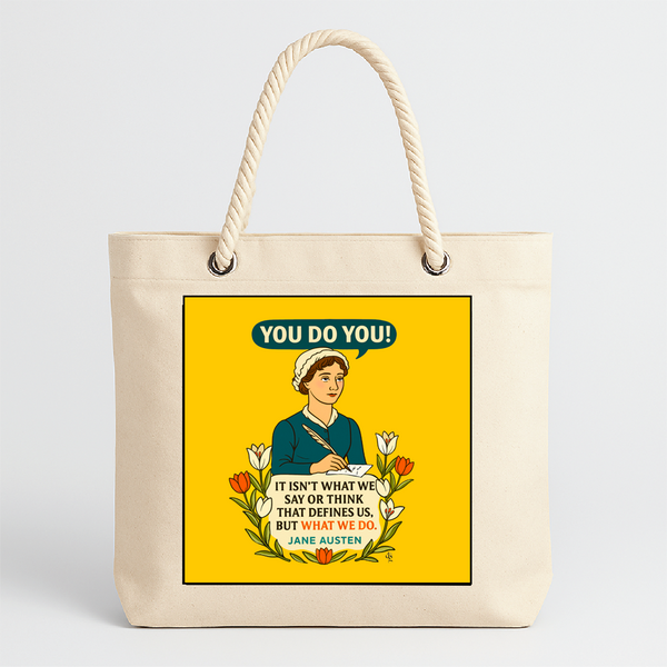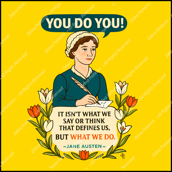 This bold 9” x 9” 100% cotton fabric art panel honors beloved author Jane Austen with her timeless quote: “It isn’t what we say or think that defines us, but what we do.” The message bubble reads “You Do You!”—a nod to personal integrity and quiet strength. (Part of the Women’s Quotes Panel series)