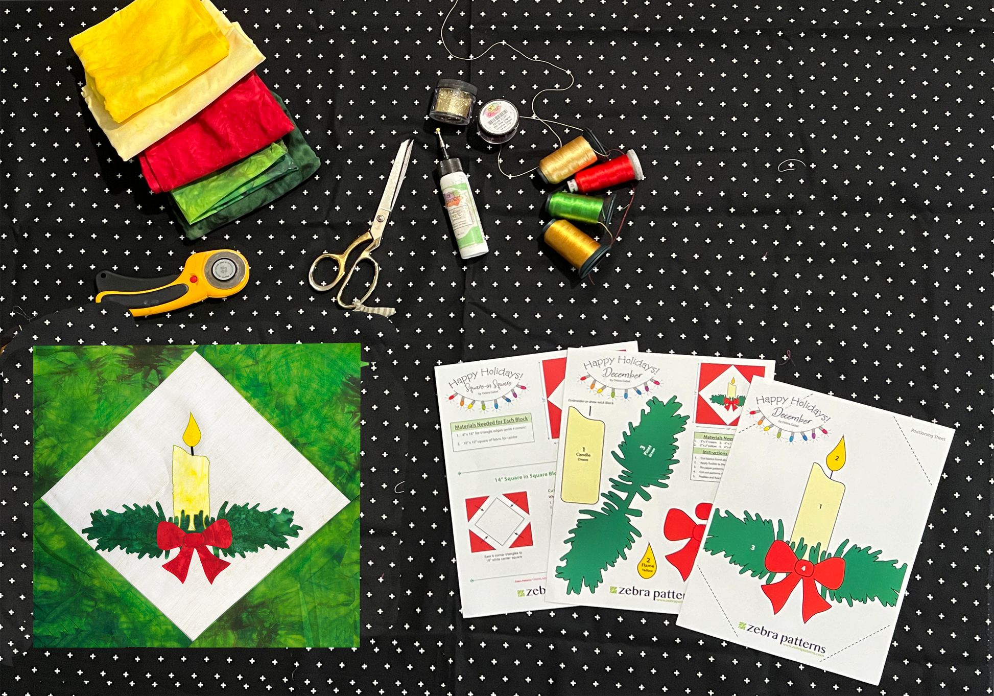 There is no guessing as to what's coming soon when the traditional December Christmas Candle makes its appearance in windows and holiday displays throughout the town. Only fitting that this should be the last piece to complete your Happy Holidays quilt.