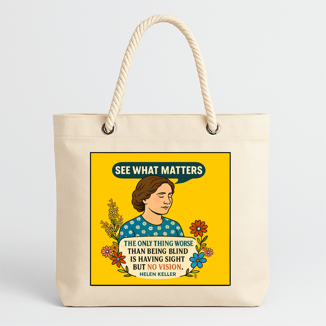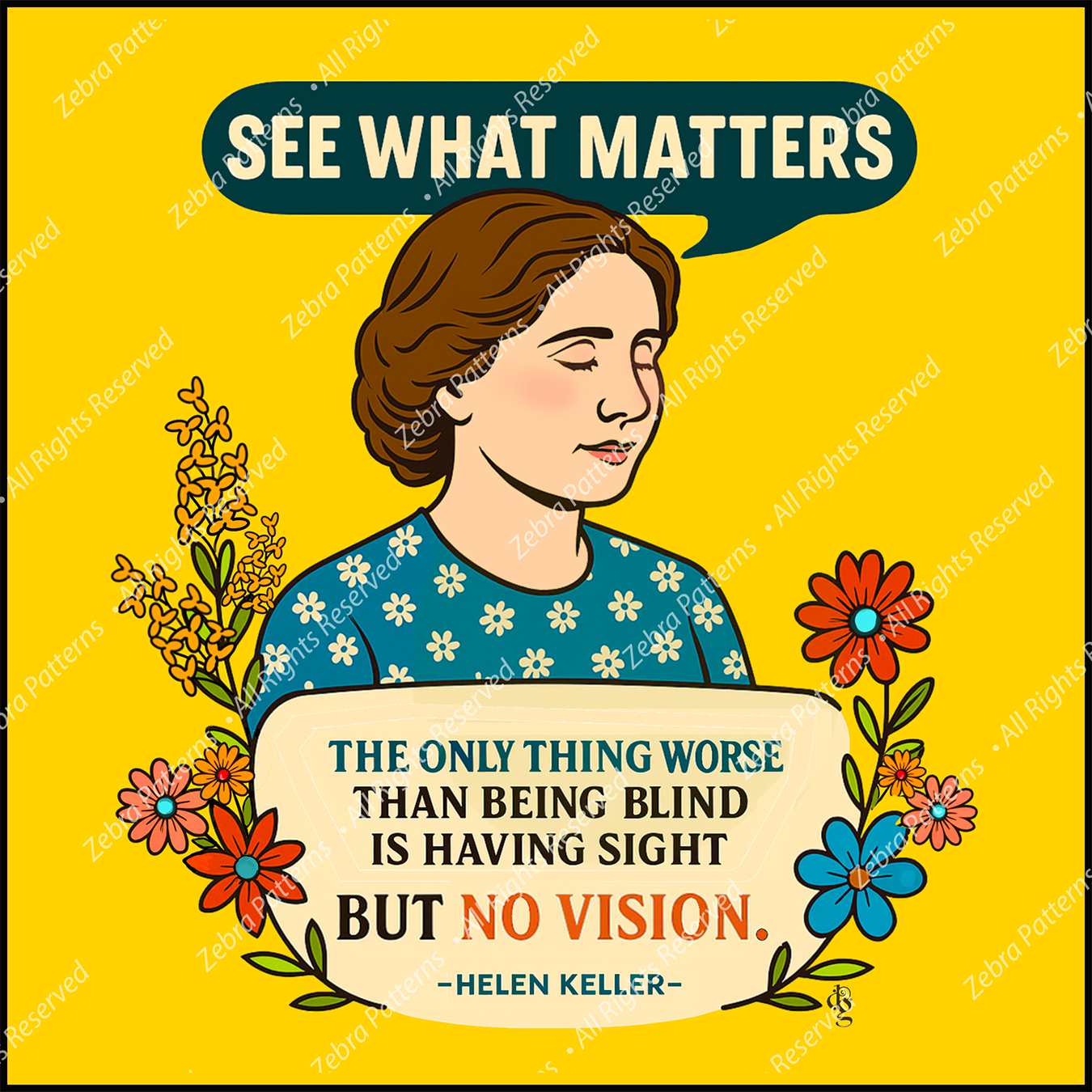 This bold 9” x 9” 100% cotton fabric art panel honors author and advocate Helen Keller with her insightful quote: “The only thing worse than being blind is having sight but no vision.” The message bubble reads “See What Matters,” celebrating clarity, purpose, and inner wisdom. (Part of the Women’s Quotes Panel series.)