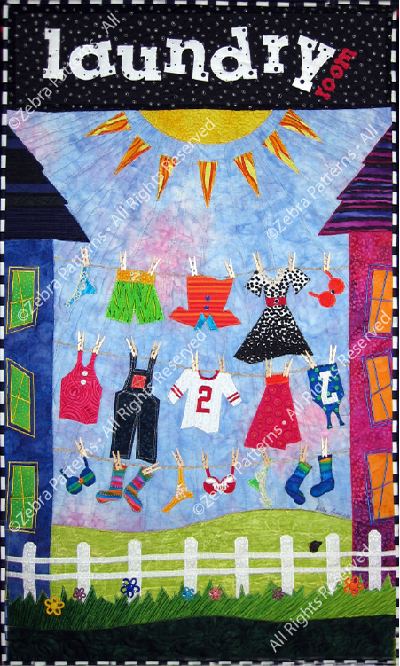 This pattern came about through a suggestion from one of my favorite quilt shop owners. Jackie, the owner of Patches Quilting in Mt. Airy, MD complimented me on a sweater I was wearing that had a clothesline on it! She told me to make a quilt like that! I thought about it and I thought everyone has a laundry room. We all spend plenty of time there. Why not make a door size wall hanging to brighten up the laundry room. Jackie's idea became the first in a series of quilts that are made especially for doors. I have a wooden dowel through my quilt and it hangs on my laundry door. The door hanger quilt finishes at 22" x 36" and there are wooden clothespins included in the pattern packet! It is so much fun! The quilt is pieced and fused. This is a unique touch for your home or for a gift.