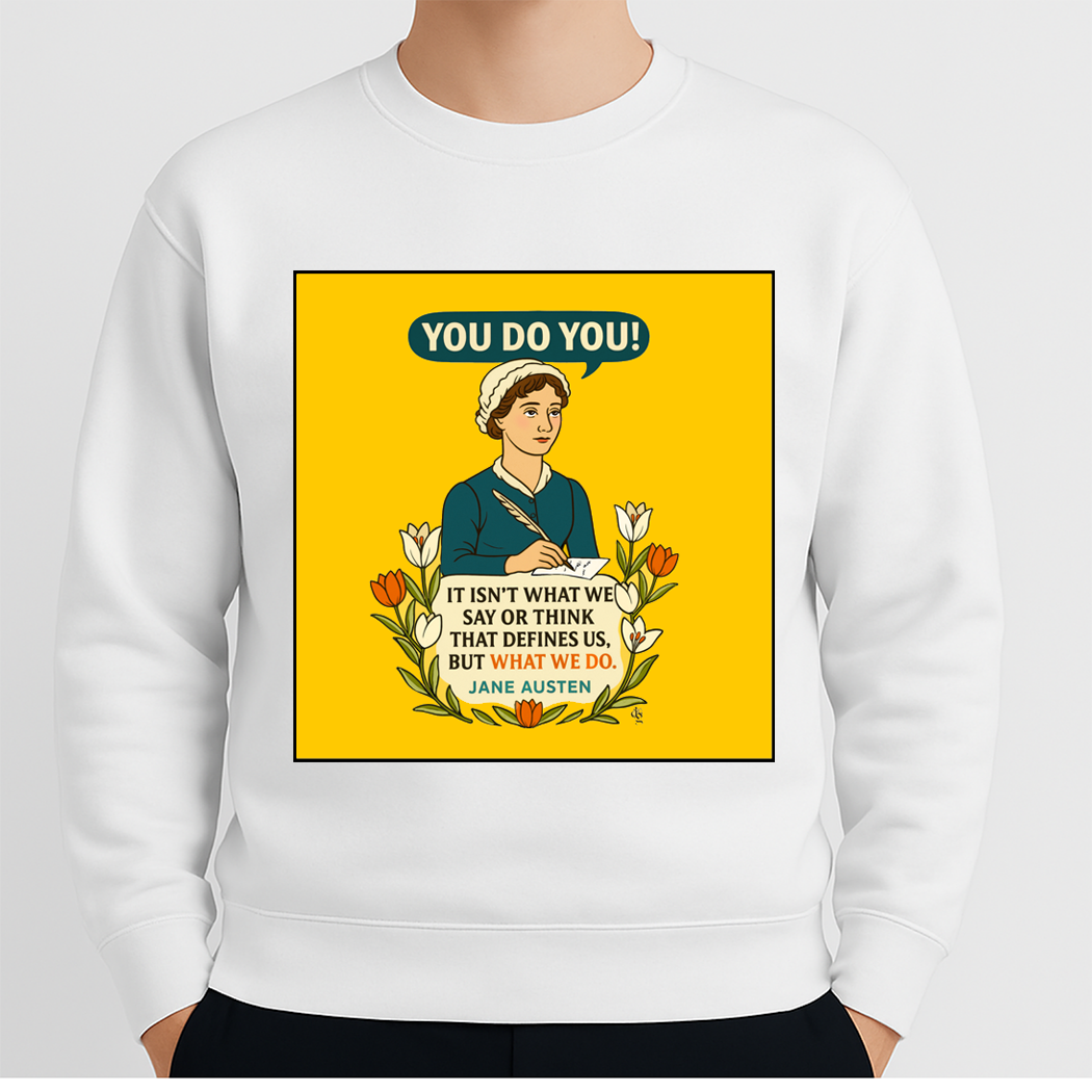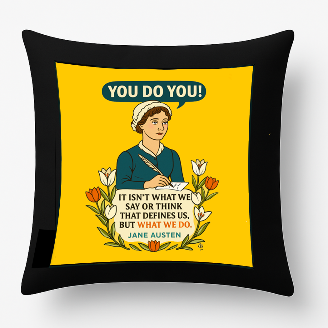 This bold 9” x 9” 100% cotton fabric art panel honors beloved author Jane Austen with her timeless quote: “It isn’t what we say or think that defines us, but what we do.” The message bubble reads “You Do You!”—a nod to personal integrity and quiet strength. (Part of the Women’s Quotes Panel series)