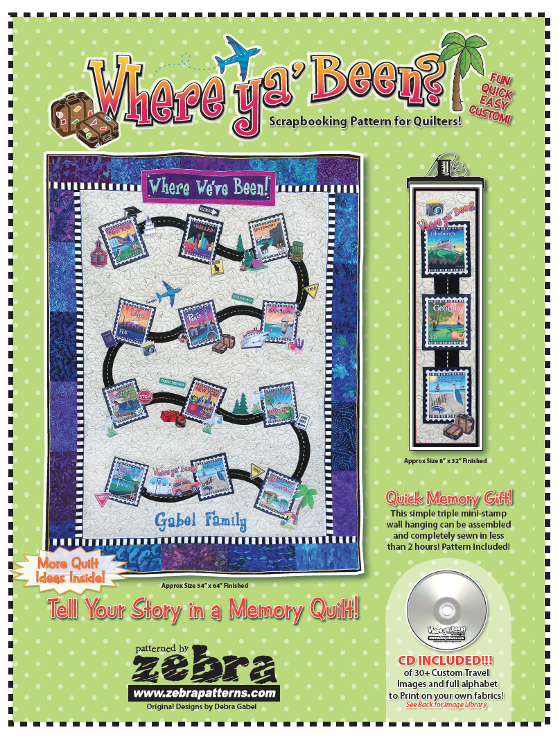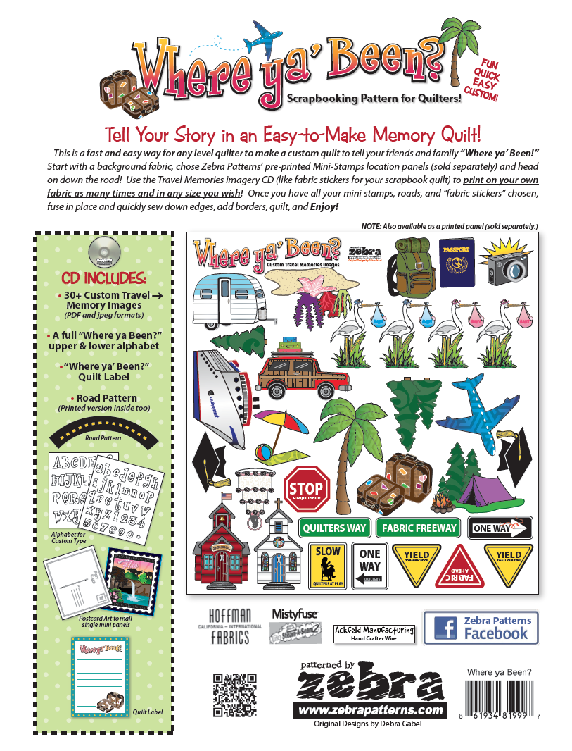 Themed patterns, printed fabric stickers, banners, full project background panels and printable sticker CDs for your Where Ya' Been projects! Think Scrapbooking for Quilters™ and decorate your Where Ya' Been projects with fun and fanciful fabric stickers and banners!